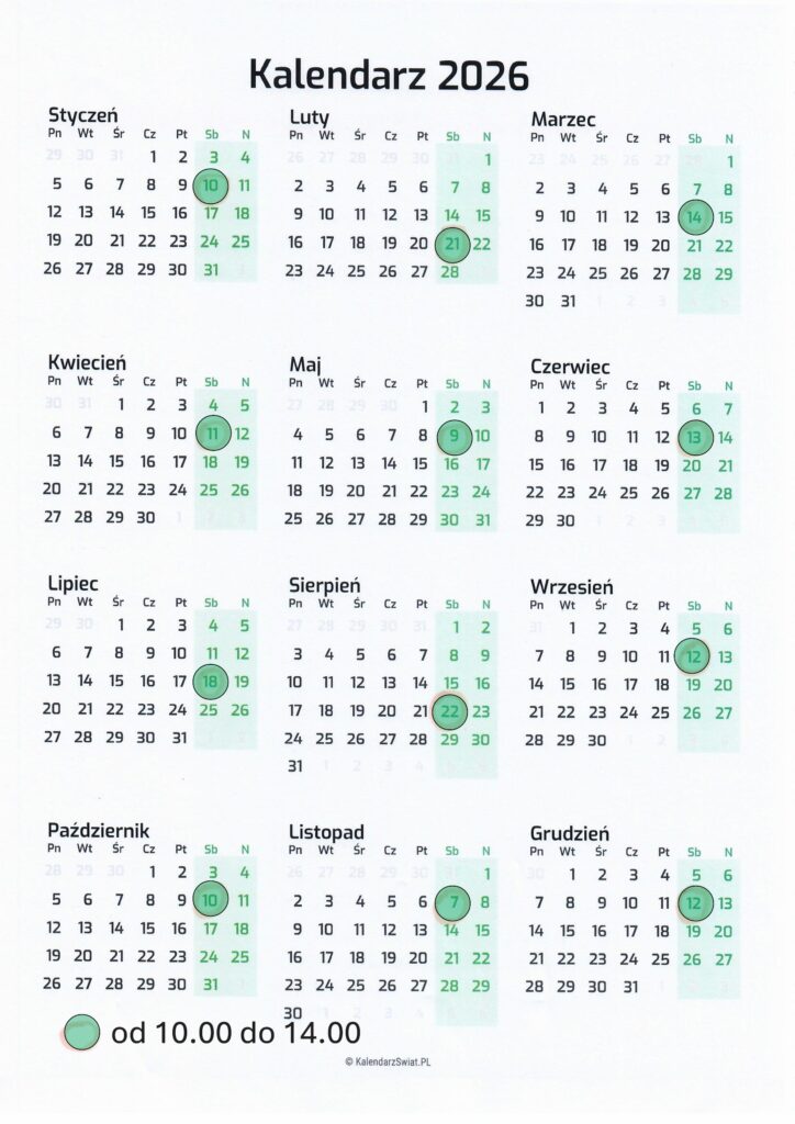 - Strzelnica otwarta jest w dni wg poniższego kalendarza w godzinach od 10.00 do 15.00